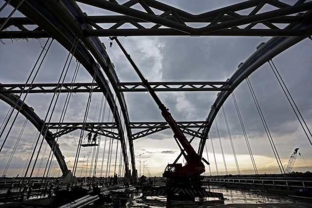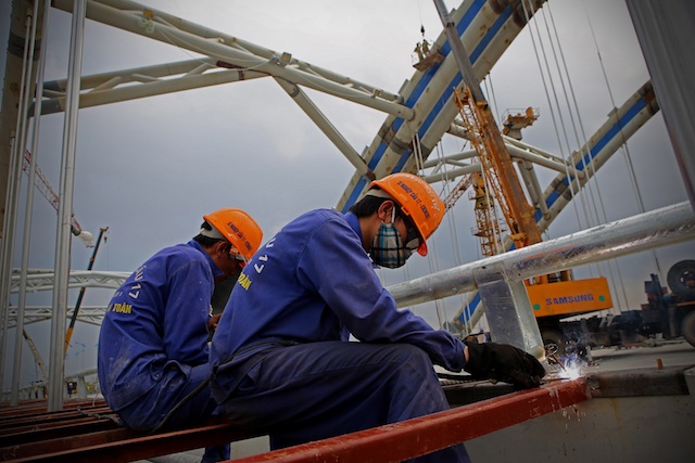 Công nhân Xí nghiệp cầu 17 (Cienco1) hàn mối giằng giữa hai làn cầu Đông Trù