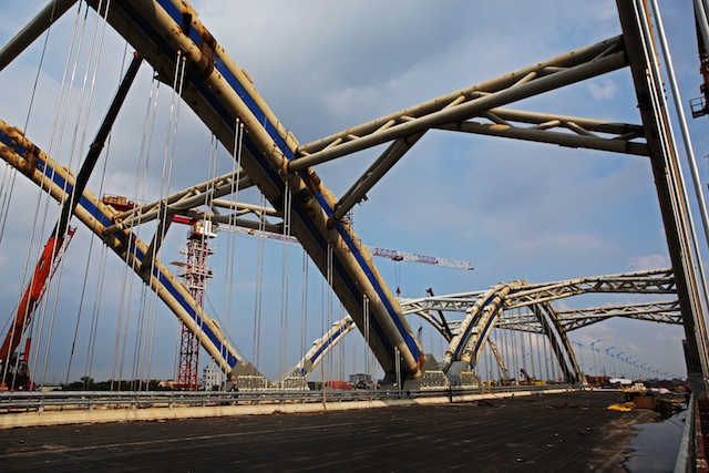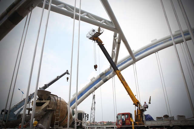 Hai ngày 10/4/2014 và 6/5/014 là những dấu mốc quan trọng quyết định về kỹ thuật thi công, cũng như tiến độ hoàn thành dự án khi hai đoạn vòm hợp long tổ hợp dài 53 m, rộng 23 m, nặng 280 tấn được lắp đặt chính xác và an toàn. Đây là phương pháp lắp đặt vòm thép chưa có tiền lệ thi công cầu ở Việt Nam cho đến nay. Thách thức lớn nhất trong quá trình lắp vòm, lao dầm là sự đòi hỏi khắt khe về kiểm soát cao độ của đỉnh sườn vòm, lực căng cáp giằng và chuyển vị chân vòm. Tất cả phải chính xác tuyệt đối bởi với nhịp liên tục, nếu nâng sai một nhịp sẽ kéo theo các nhịp khác.