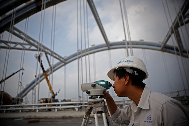 Kỹ sư Xí nghiệp cầu 18 (Cienco1) đo đạc kỹ thuật mặt cầu trước khi thảm nhựa đường