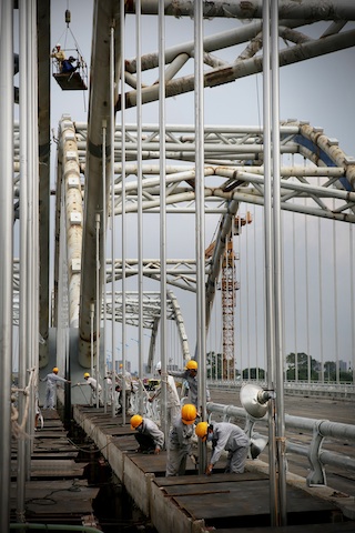 Công nhân Xí nghiệp cầu 17 (Cienco1) sơn mái vòm cầu Đông Trù